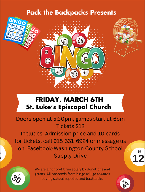March 6th -BINGO at St Luke’s Episcopal Church 210 E 9th St, Bartlesville, OK 74003.